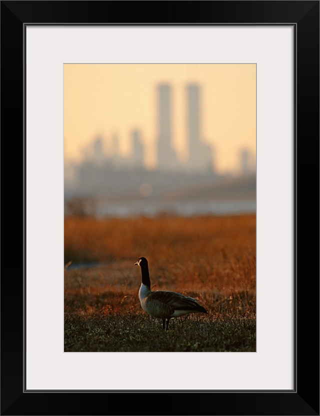 <p>Canada goose (Branta canadensis) and hazy Twin Towers skyline.</p>