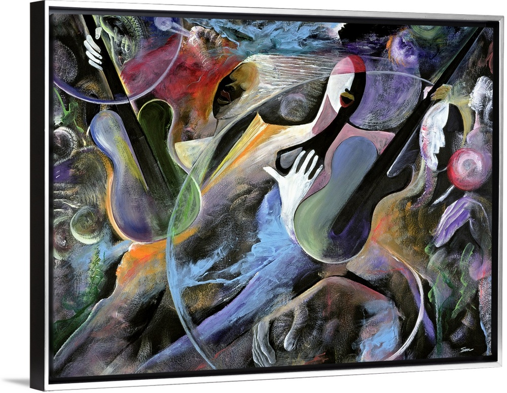 <p>Contemporary, jazz inspired wall art of abstract figures playing string instruments in a night club.</p>