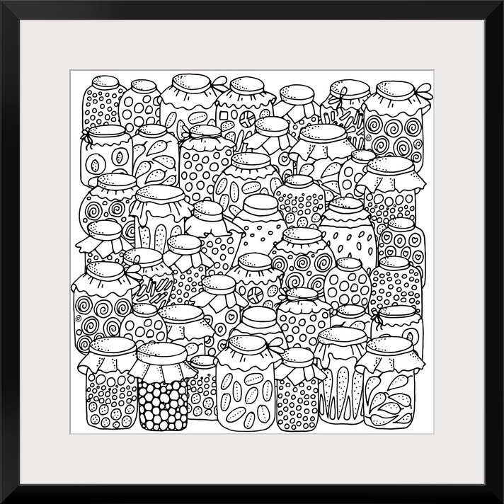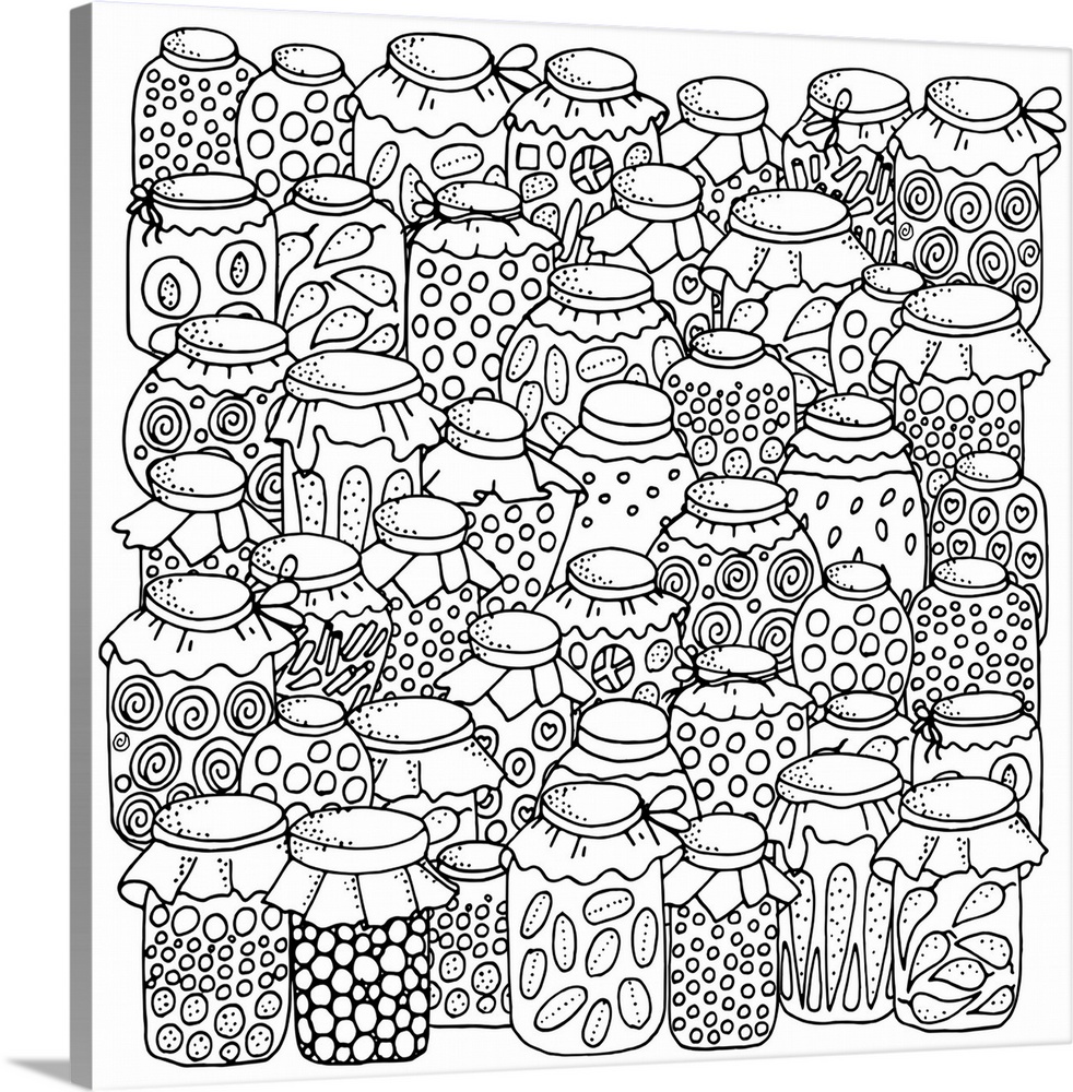 <p>Contemporary line art of mason jars filled preserves, pickles, jams, jellies, and other foods. Perfect for Coloring Canvas.</p>