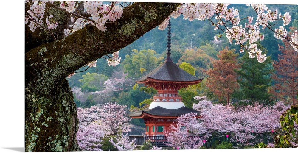 <p>Fine art photograph of a building in Japan surrounded by blossoming trees.</p>