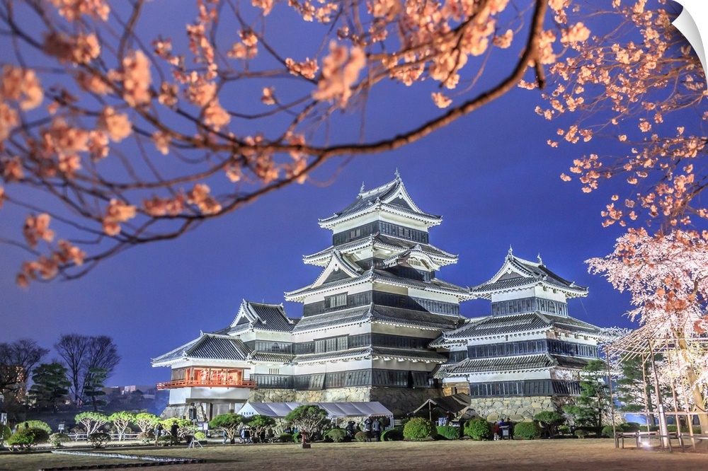 <p>Japan, Chubu, Matsumoto, Matsumoto Castle during the cherry blossom, sakura, by night.</p>