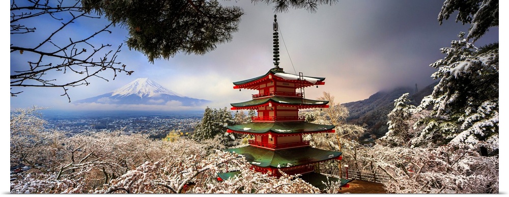 <p>Japan, Chubu, Fuji-Hakone-Izu National Park, Mount Fuji and Chureito Pagoda, Arakura Sengen Shrine during cherry blossom (sakura).</p>