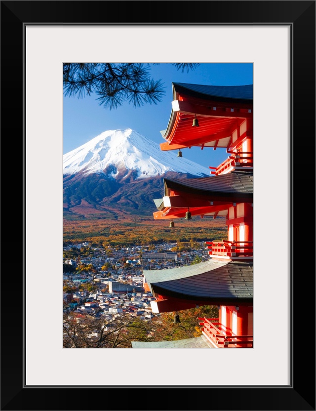 <p>Japan, Central Honshu (Chubu), Fuji-Hakone-Izu National Park, Mount Fuji capped in snow and the upper levels of a temple</p>