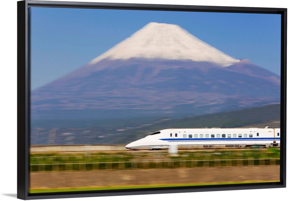 <p>Japan, Houshu, Shinkansen (Bullet train) which reaches speeds of up to 300km/h passing Mount Fuji (blurred motion)</p>
