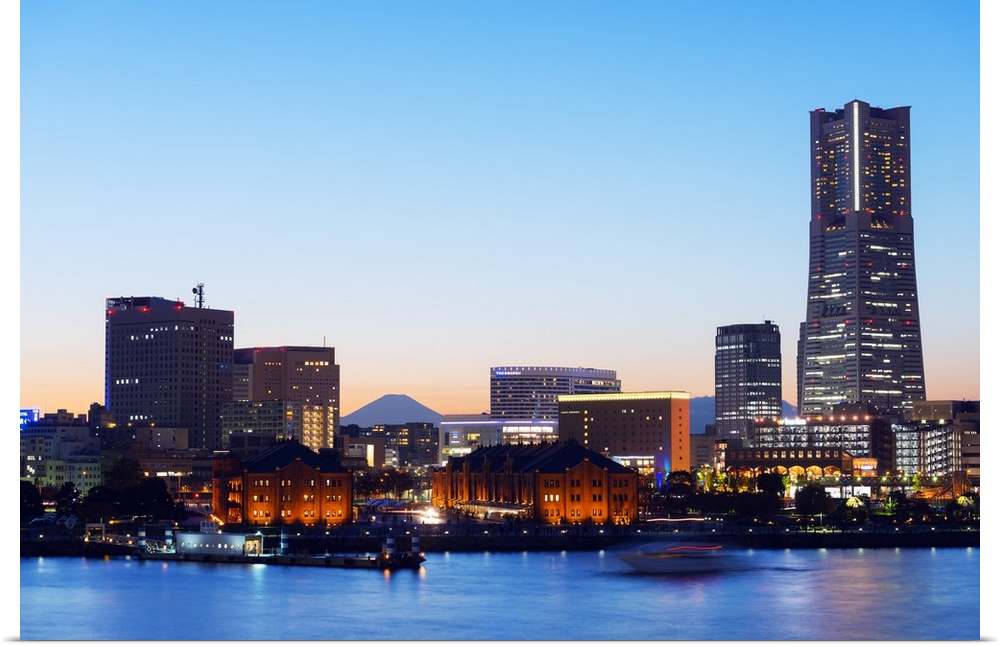<p>Asia, Japan, Honshu, Yokohama Bay, city skyline and Mt Fuji, Landmark Tower.</p>