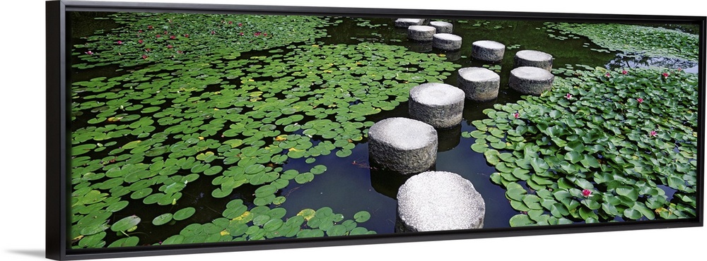 <p>Large stepping stones stand in a pond thatos surface is covered with lily pads.</p>