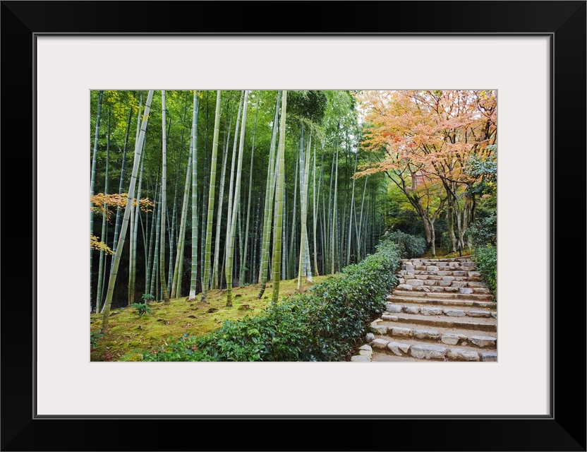 <p>Asia, Japan. Kyoto, Sagano, Arashiyama, Jojakko ji (Jojakkoji) Temple (16th Century),bamboo grove and autumn leaves.</p>