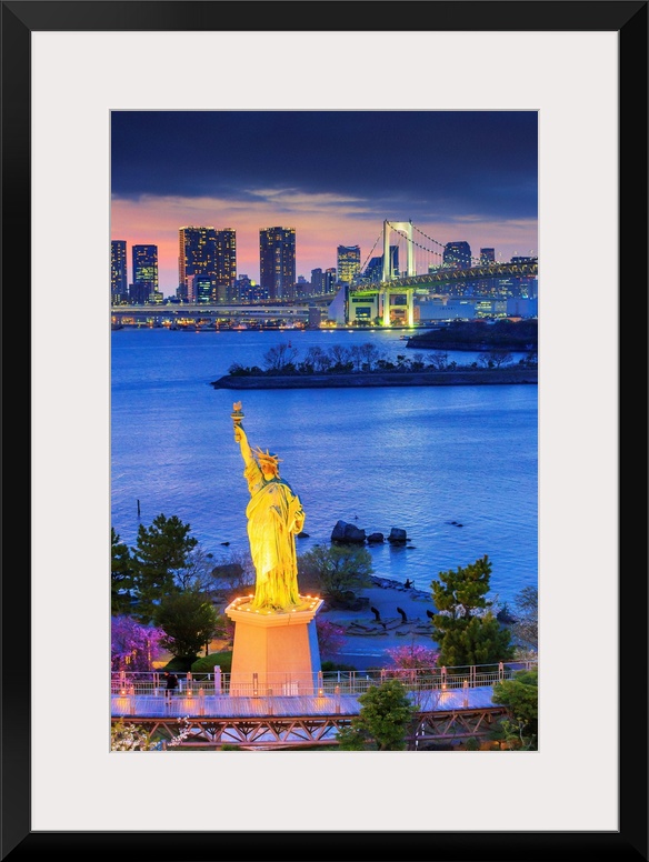 <p>Japan, Kanto, Tokyo, Minato, Rainbow Bridge, Rainbow bridge and replica of the Statue of Liberty in Odaiba.</p>