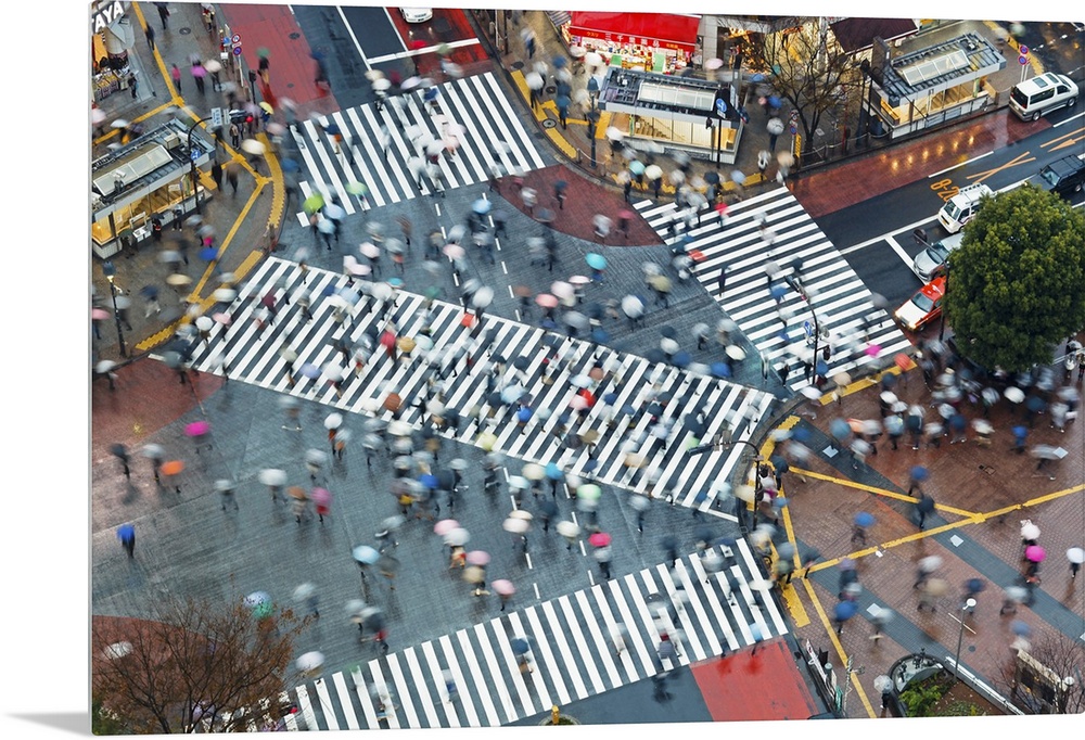 <p>Asia, Japan, Tokyo, Shibuya, Shibuya Crossing - crowds of people crossing the famous crosswalks at the centre of Shibuyas fashionable shopping and entertainment district - elevated view</p>
