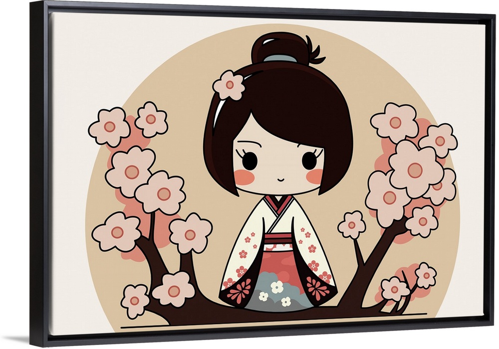 <p>Japanese chibi female character with traditional kimono. Sakura flowers, hanami background. Originally a vector illustration.</p>