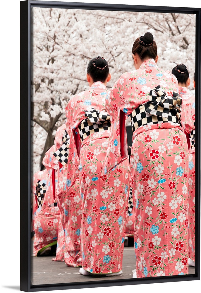 <p>Group of female Japanese dancers in traditional costumes celebrate cherry blossom at spring festival</p>