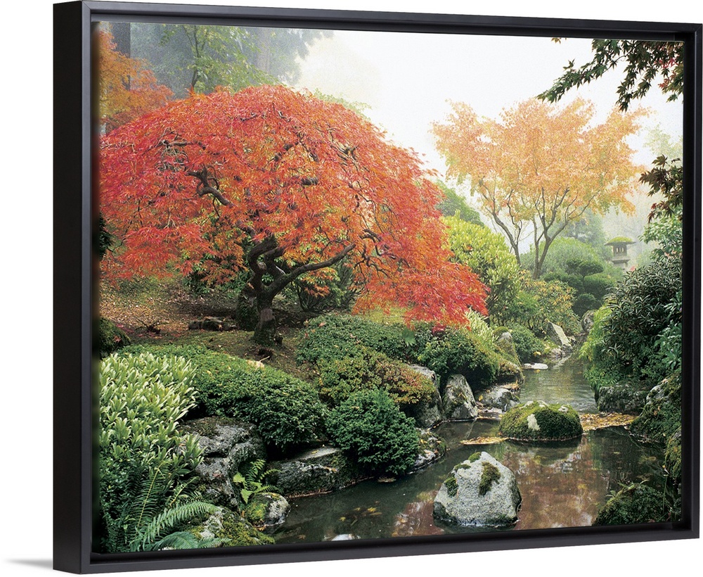 <p>Oversized, landscape photograph of a rocky stream surrounded by greenery and fall colored trees and foliage in a Japanese garden.</p>