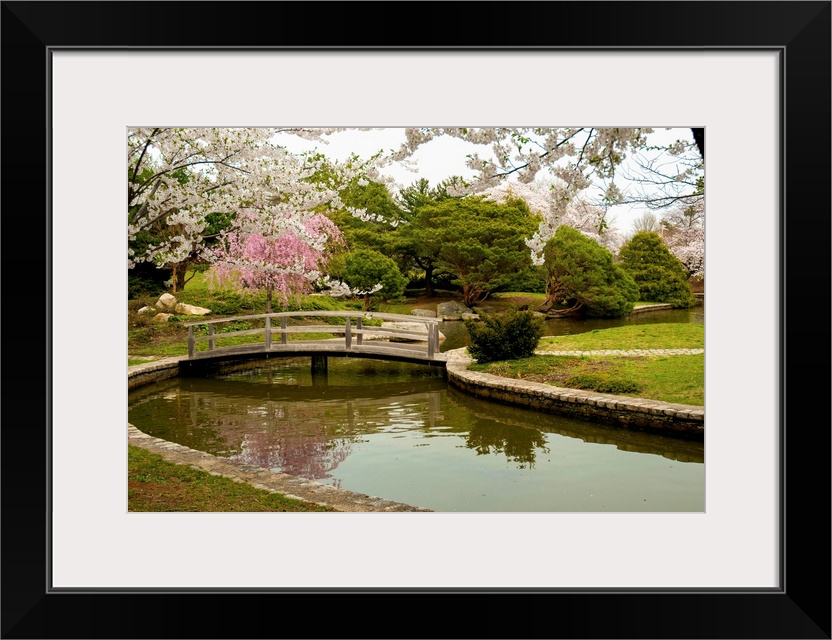 <p>Large canvas photo art of a bridge crossing a river with flowering Japanese trees sprinkled around a garden.</p>