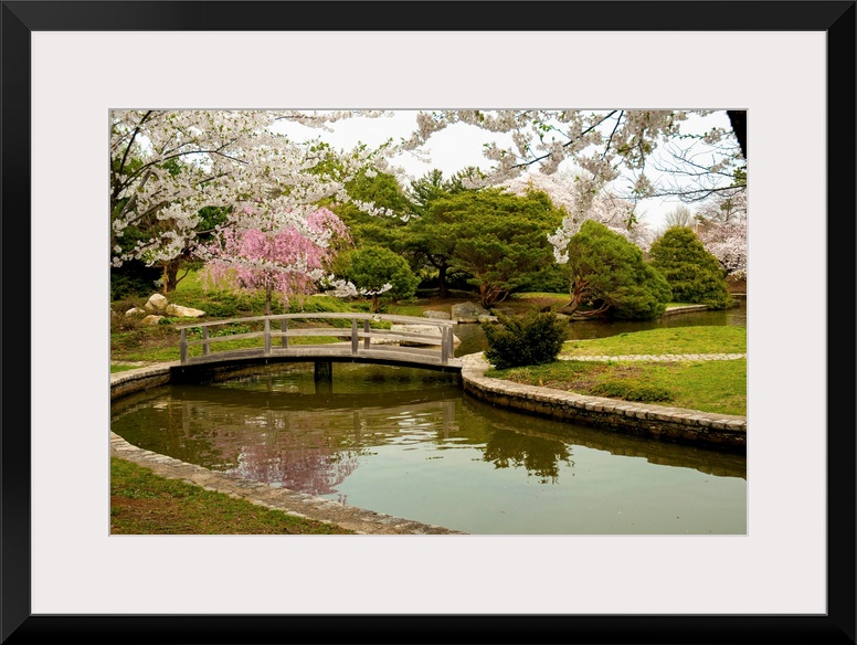<p>Large canvas photo art of a bridge crossing a river with flowering Japanese trees sprinkled around a garden.</p>