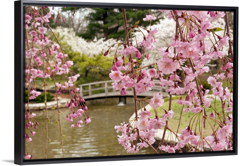 <p>From the National Geographic Collection, a giant photograph taken from behind the branches of a budding tree overlooking a bridge spanning a body of water and connecting two landmasses. In the background there is a variety of different bushes and trees filling the picture.</p>