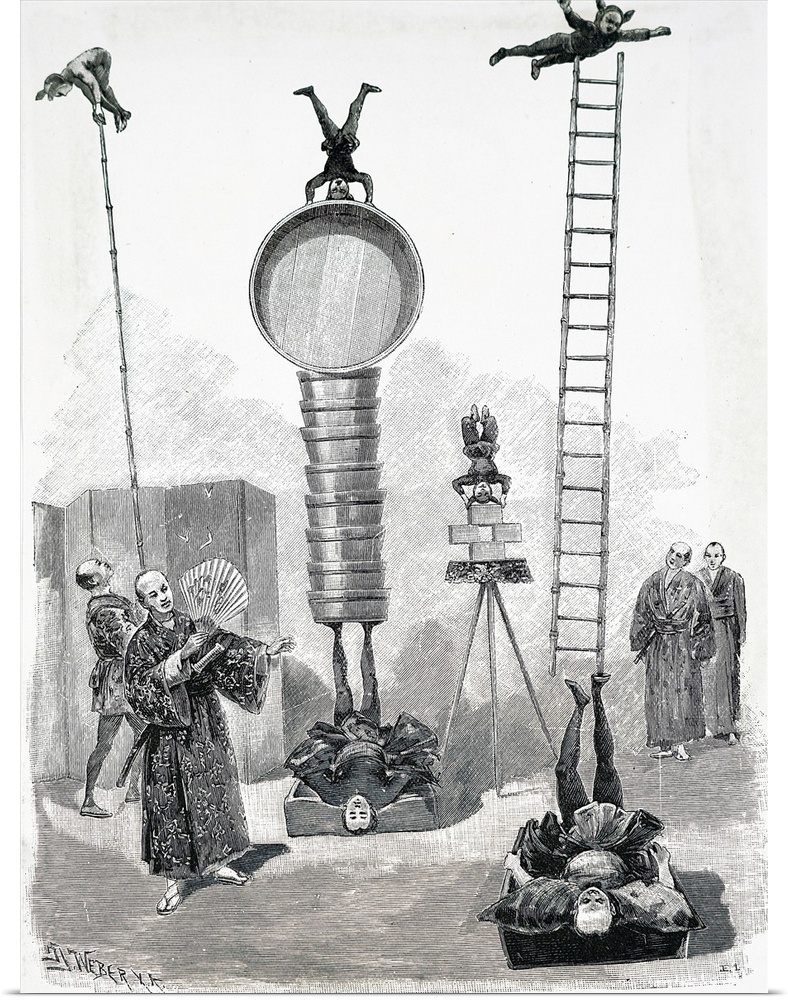<p>Engraving depicting Japanese jugglers using the centre of gravity to keep the acrobat from falling. Dated 19th Century.</p>