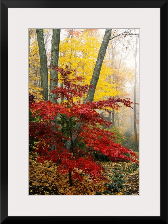 <p>Long vertical photo print of warm fall foliage in a foggy forest.</p>