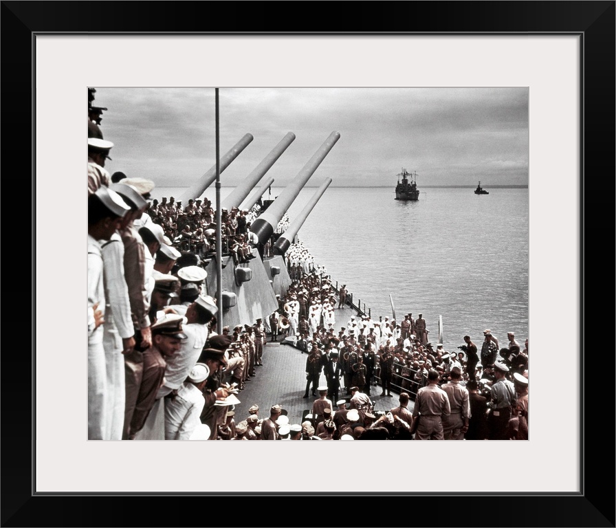 <p>A view of the Japanese representatives at the surrender ceremonies on board the USS Missouri in Tokyo Bay, 2 September 1945. Photograph.</p>