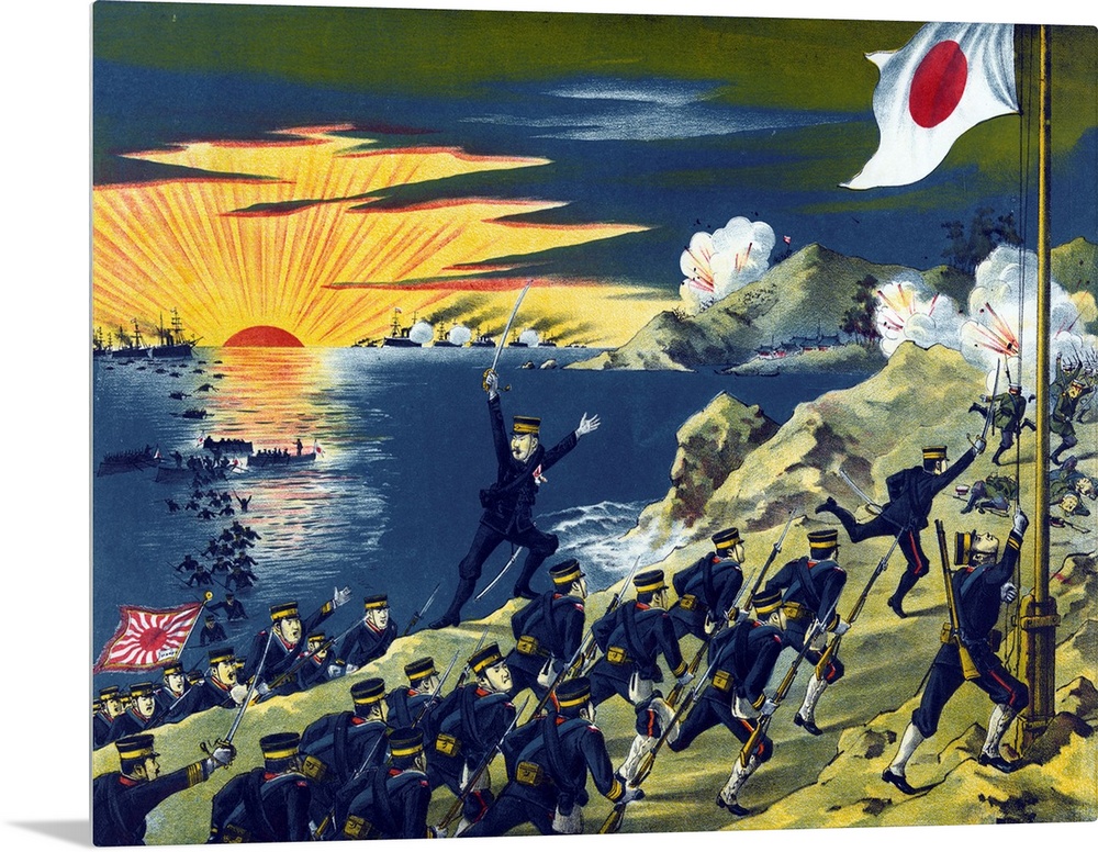 <p>Woodcut illustration of the Japanese Second Army landing on the Liaodong Peninsula. As a result, the Russian troops flee. RussoJapanese war. 1904.</p>