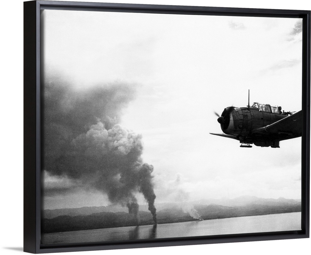 <p>Aerial view of beached Japanese transport burning on Guadalcanal during the Battle of Solomon Islands. Photograph, 16 November, 1942</p>