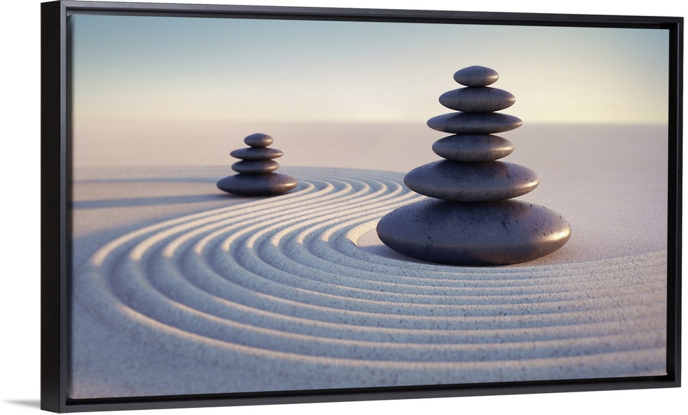 <p>Japanese Zen garden - two stacks of pebbles in the evening sun - 3D illustration.</p>