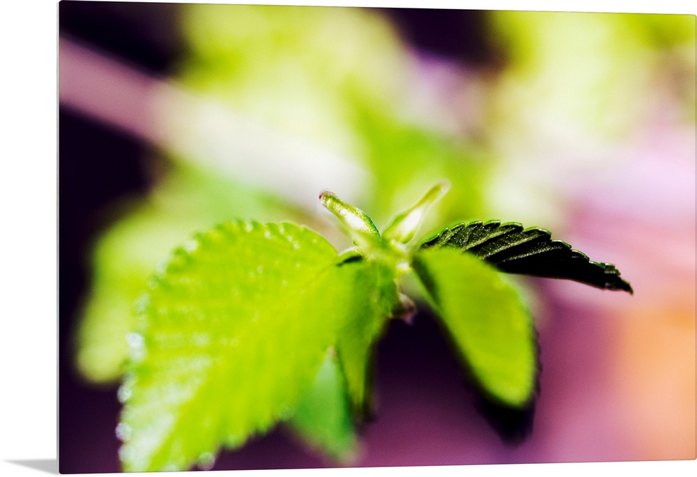 <p>Tiny leaves are photographed closely with the focus on a couple and the others appear blurry.</p>