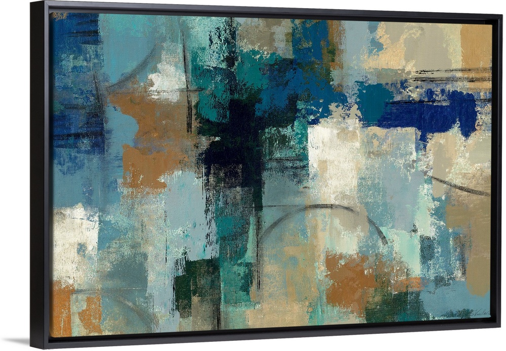 <p>Abstract artwork that consists of neutral and cool colors patched together in no particular pattern.</p>