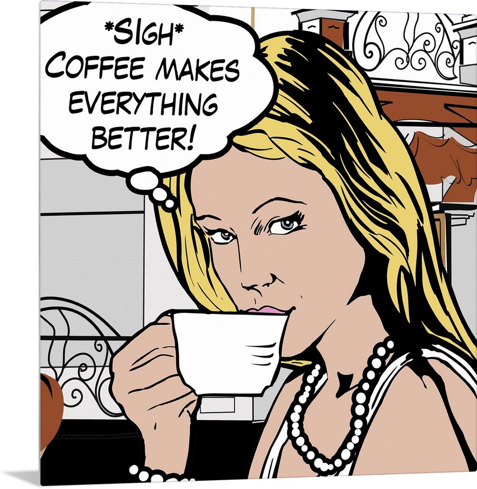 <p>Pop art style decor artwork of a woman drinking coffee with a thought bubble coming from her head.</p>