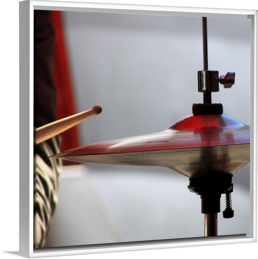 <p>Jazz player and his hi-hat cymbalsJust seen elbow and drumstickreddish tone and reflections on the metal from natural light underneath an awningOutdoor jazz performance.</p>