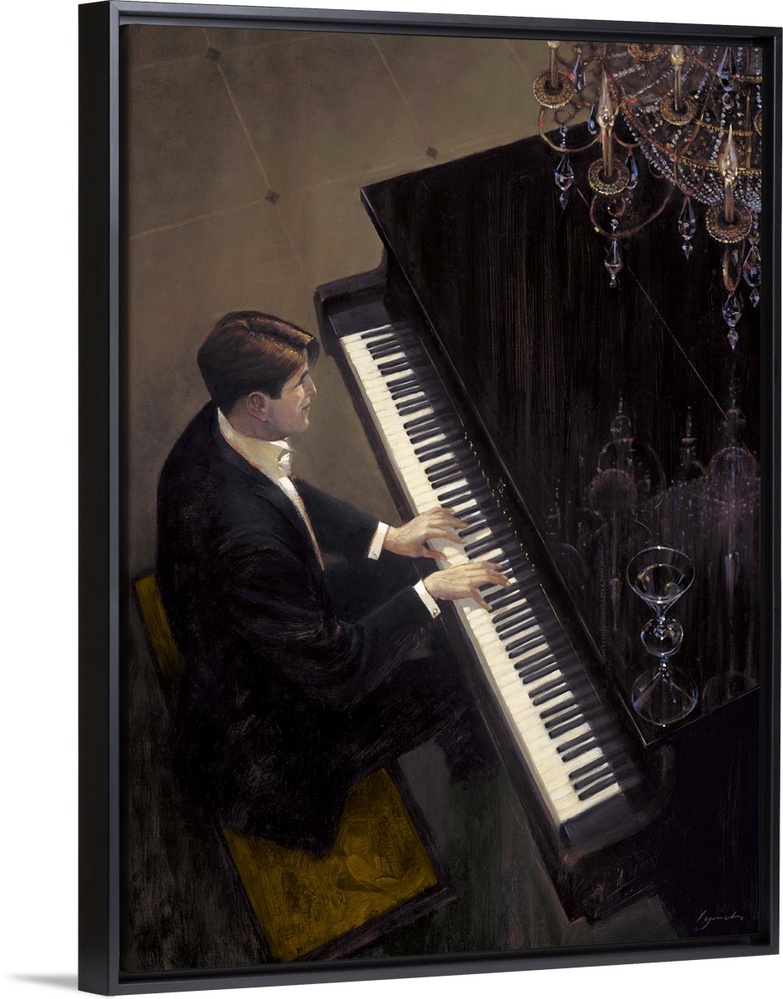 <p>Contemporary painting of a man playing a piano, with chandelier over head.</p>