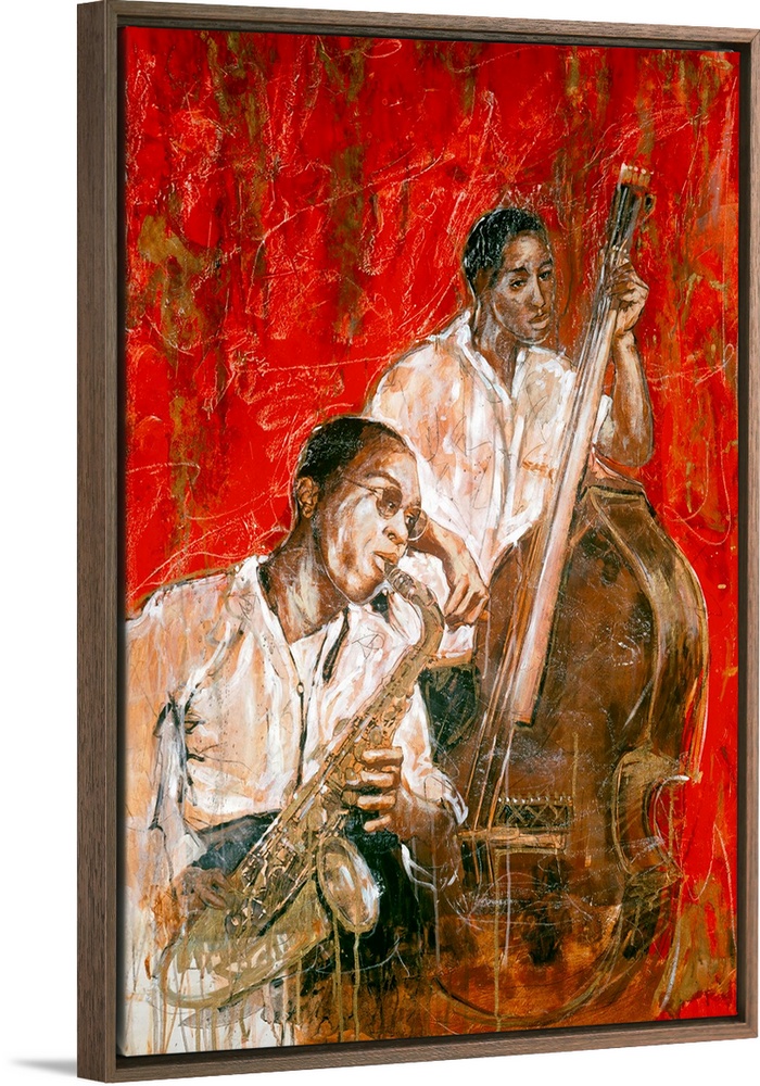 <p>Vertical, large contemporary painting of two African American Jazz musicians, one playing the saxophone, the other a large bass, on a swirling background of scribbled, multidirectional brushstrokes and lines.</p>