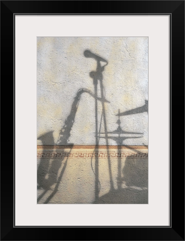 <p>Contemporary painting of instruments and band equipment casting shadows on a wall.</p>