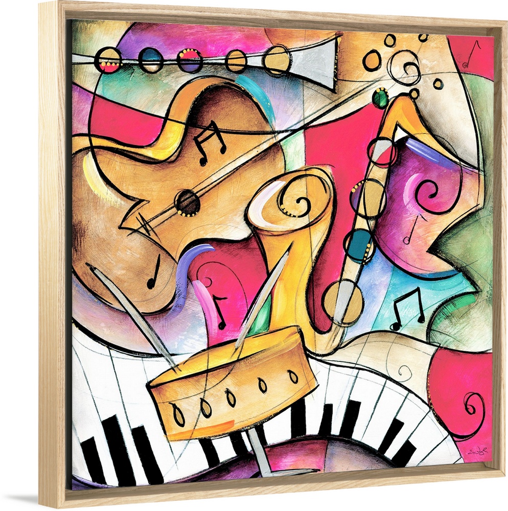 <p>Jazz it Up II by Eric Waugh. A square abstract painting of varies instruments played in jazz music.</p>