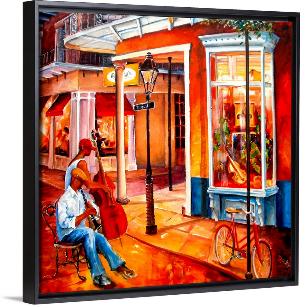 <p>Contemporary painting of man playing clarinet and man playing bass outside a street cafo at night. The street shops have balconies.</p>