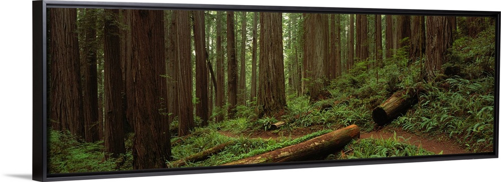 <p>Wide angle photograph taken in a thick forest with large tree trunks that sit on a hill.</p>