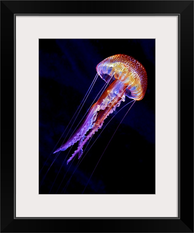 <p>A vibrant colorful jellyfish swimming against a black background.</p>