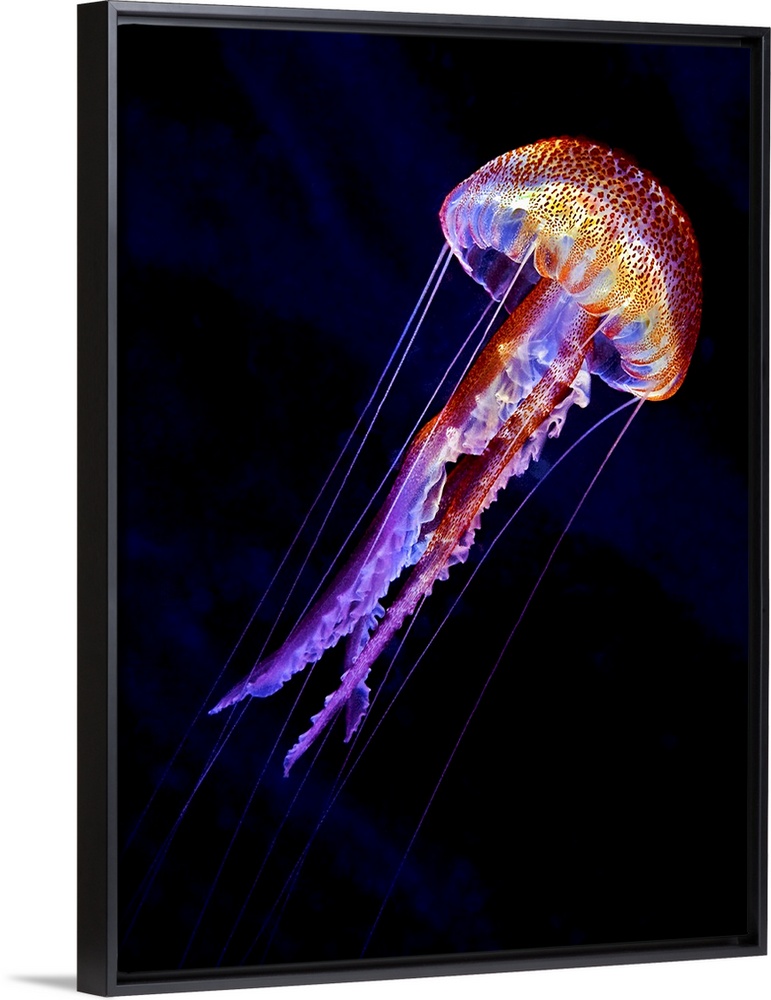 <p>A vibrant colorful jellyfish swimming against a black background.</p>