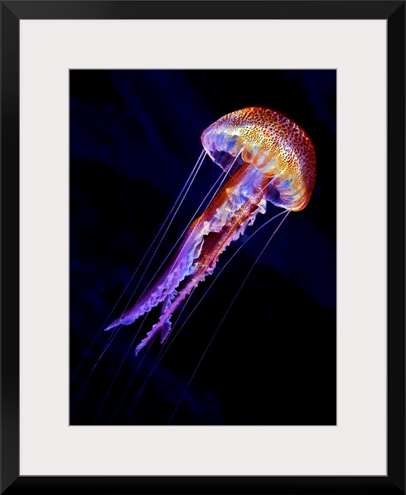 <p>A vibrant colorful jellyfish swimming against a black background.</p>