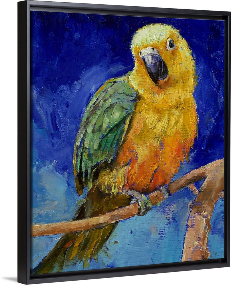 <p>Vertical oil painting on a large wall hanging of a Jenday Conure bird, perched on a branch, against a bright blue background.</p>
