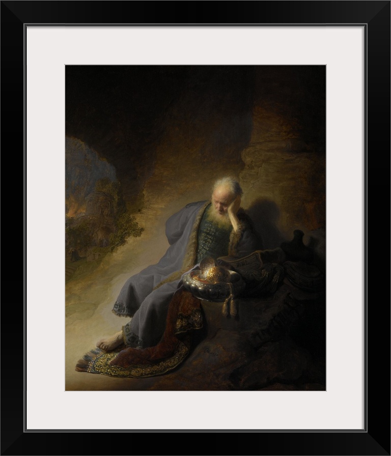 <p>Jeremiah Lamenting the Destruction of Jerusalem, by Rembrandt, 1628, Dutch painting, oil on panel. Biblical prophet Jeremiah sits outdoors with a golden bowl, carpet and books, apparently objects saved from the ruined temple. In left background, burning Jerusalem falls to the Babylonian army in the 6th century BCE.</p>