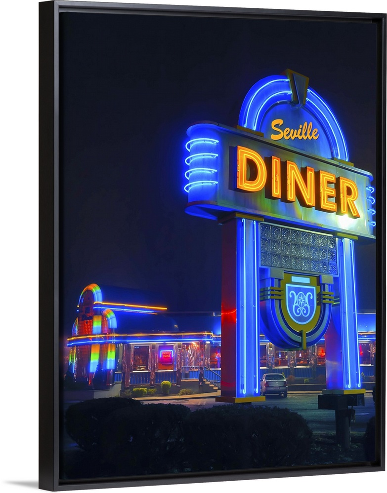 <p>Bright blue neon sign for a diner in New Jersey, illuminated at night.</p>