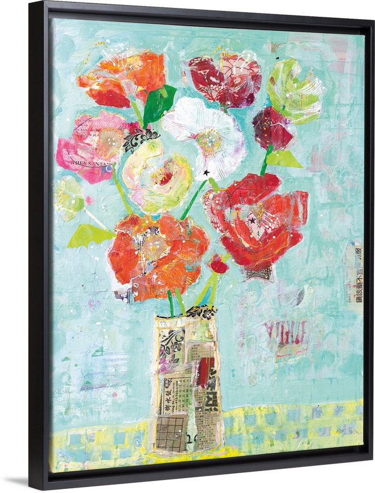 <p>Mixed media artwork creating colorful flowers in a vase made out of newspaper clippings on a light blue background.</p>