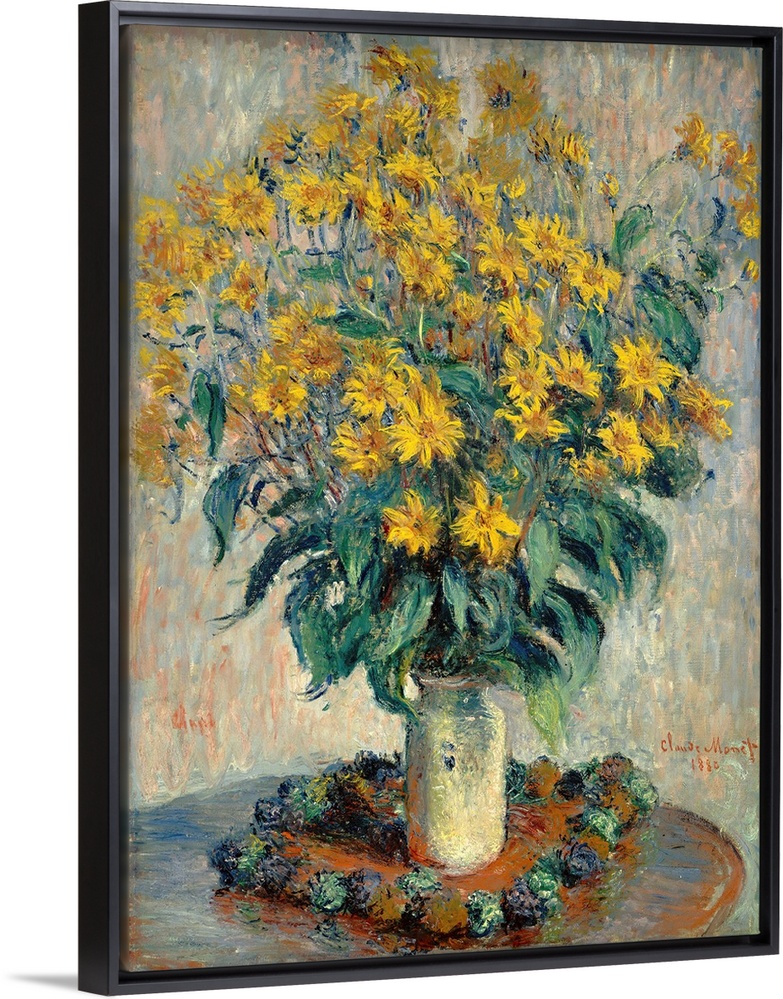 <p>Jerusalem Artichoke Flowers, by Claude Monet, 1880, French impressionist painting, oil on canvas. Flower still life of 1880 shows Monet's evolution to applying paint in similar strokes of varied color over the entire canvas</p>