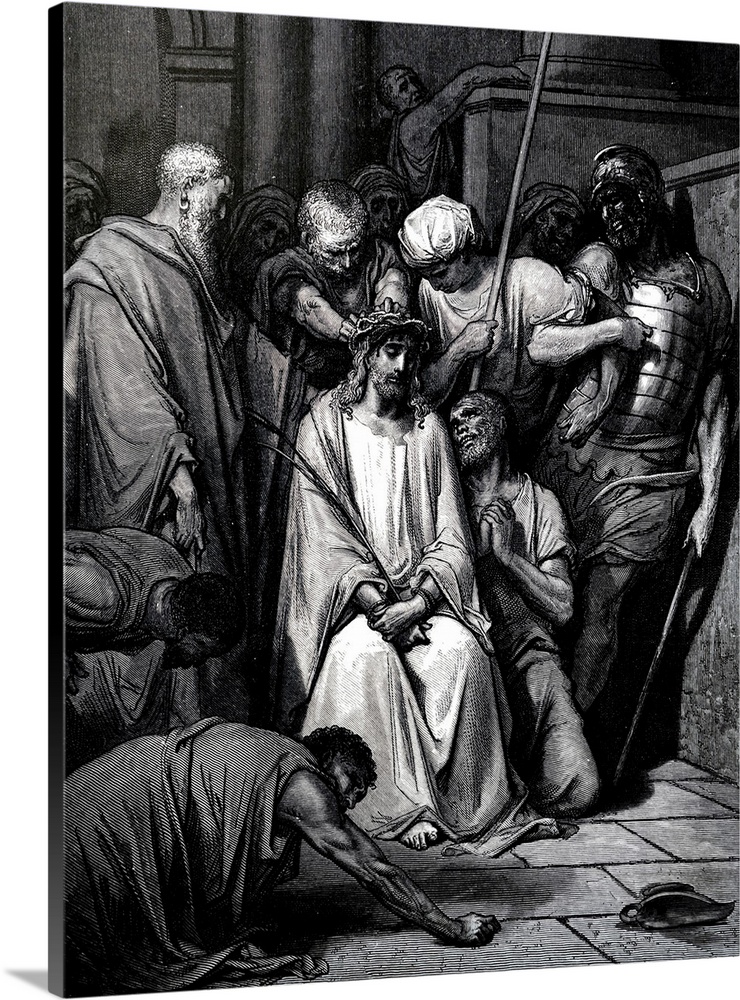 <p>Engraving depicting Jesus Christ being mocked as the crown of thorns is placed upon his head, with John the Apostle kneeling beside him. Dated 19th century.</p>