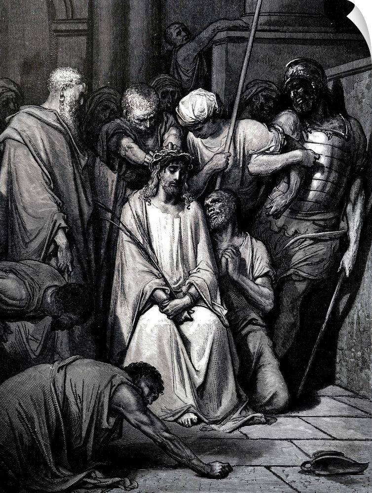 <p>Engraving depicting Jesus Christ being mocked as the crown of thorns is placed upon his head, with John the Apostle kneeling beside him. Dated 19th century.</p>
