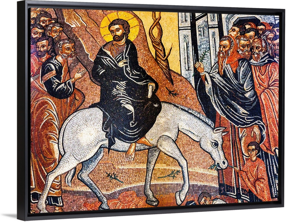 <p>Jesus Christ Palm Sunday Donkey Mosaic Saint George's Greek Orthodox Church Madaba Jordan. Church was created in the late 1800s and houses many famous mosaics</p>