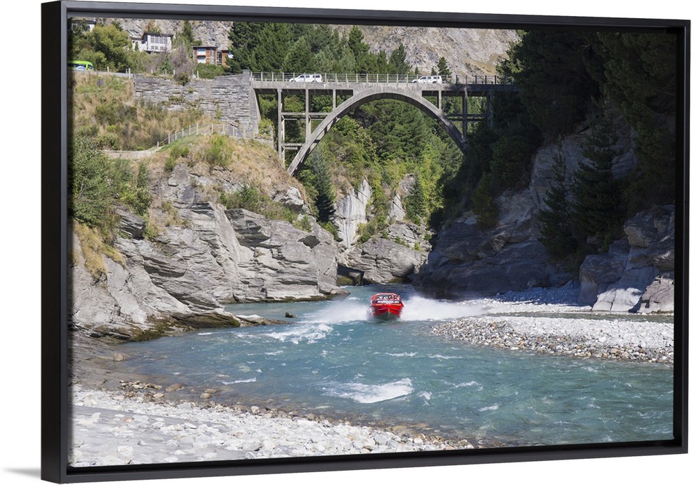 <p>Jet boat on the Shotover River below the Edith Cavell Bridge, Queenstown, Queenstown-Lakes district, Otago, South Island, New Zealand, Pacific</p>