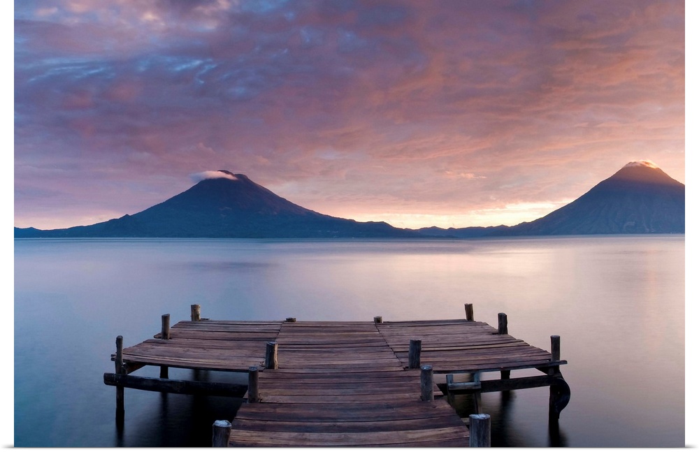 <p>Jetty in a lake with a mountain range in the background, Lake Atitlan, Santa Cruz La Laguna, Western Highlands, Guatemala</p>