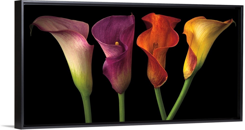 <p>A row of calla lilies in varies vibrant colors.</p>