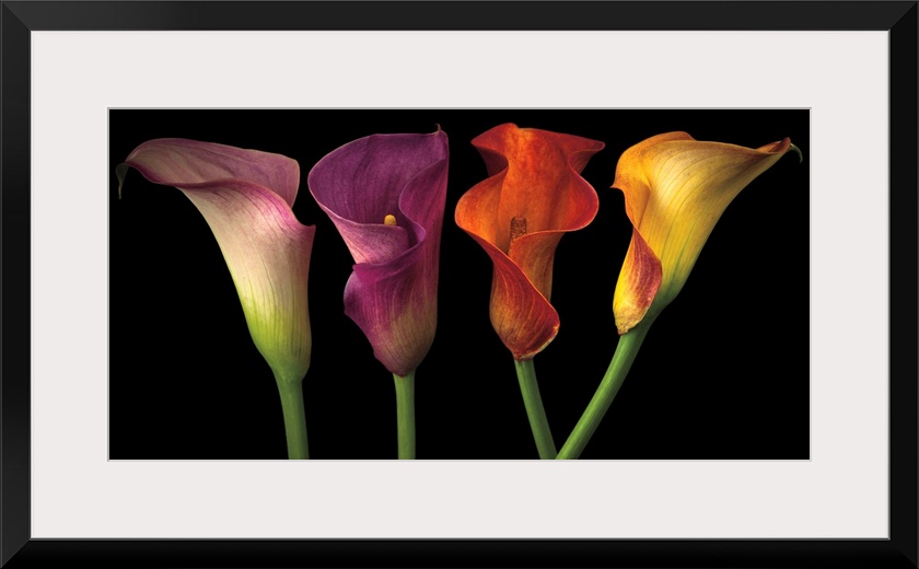 <p>A row of calla lilies in varies vibrant colors.</p>